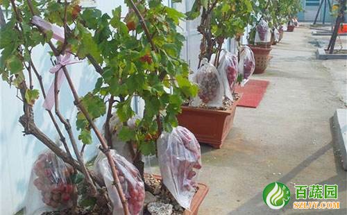 1 種類與苗木   選擇鮮食和欣賞兼用的種類,如早生高墨、乍娜、葡萄園皇后、森田尼、美人指、紅意大利、晚紅等。在冬天溫暖的南邊地區(qū),可直接扦插育苗;北方冬天冰冷需下架防寒的地區(qū),要選用抗寒砧木枝條進(jìn)行扦插,然后綠枝劈接種類育苗,也可在露地育苗,直接栽于盆內(nèi)。