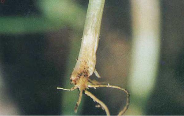 (1)幼苗期。最初呈水浸狀,后于莖基或根部產(chǎn)生褐斑,逐漸擴(kuò)大后凹陷,嚴(yán)重時病斑繞莖基部或根部一周,致地上部逐漸枯萎??v剖莖基或根部,導(dǎo)管變?yōu)樯詈稚?,后根莖腐爛,不長新根,植株枯萎而死。